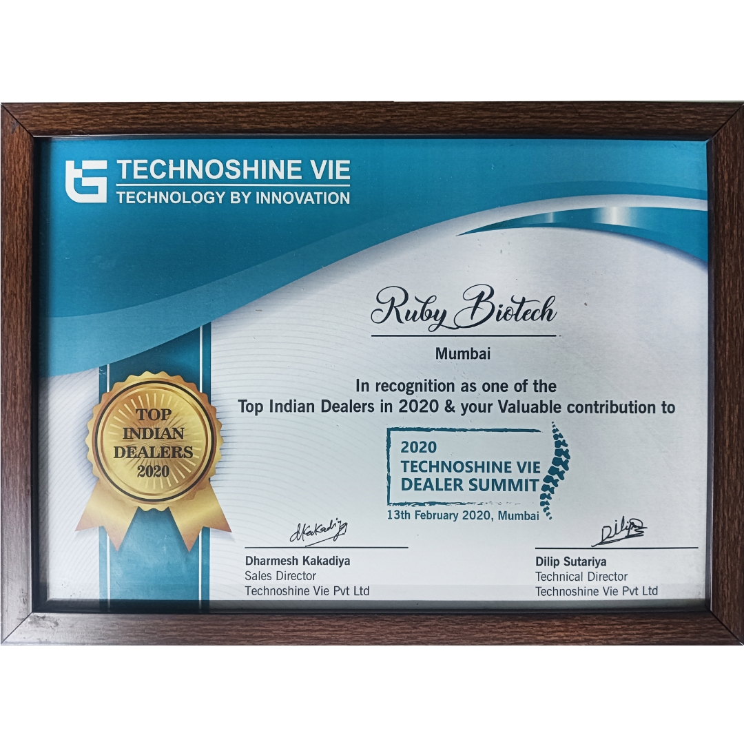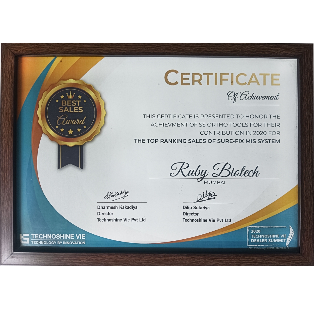 This certificate is presented to honor the achievement by Ruby Biotech for their Contribution in 2020 For the Top Ranking Sales of Sure-Fix Mis System.